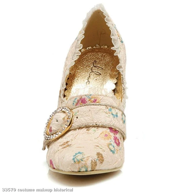 Influenced by 18th Century France, these beautiful shoes make a statement all by themselves. Annette Shoes are pale ivory, decorative satin pumps with pastel flower accents, tiny lace ruffle, 4.5″ heels, and a faux gold & rhinestone buckle on each shoe.