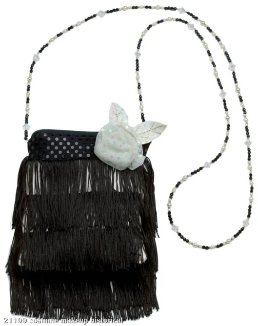 This flapper handbag is perfect for any 1920’s or 1930’s diva outfit! Bring your costume to life with this small, black purse with beaded strap and black fringettes! The white nylon flower on the side makes it a little more fancy looking, in case you want to really put on the ritz!!