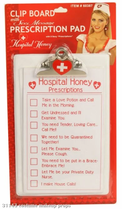 Prescribe treatments with our Hospital Honey Clip Board! Includes a clip board with sexy message prescription pad. The perfect finishing touch to your naughty look this Halloween!