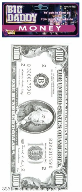 Grab as much as you can! This prop money will give your ‘Daddy’ costume a real effect! Big Daddy Money is a pad of $100 oversized fake bills. Printed on the front only, it’s white paper with Black ink.